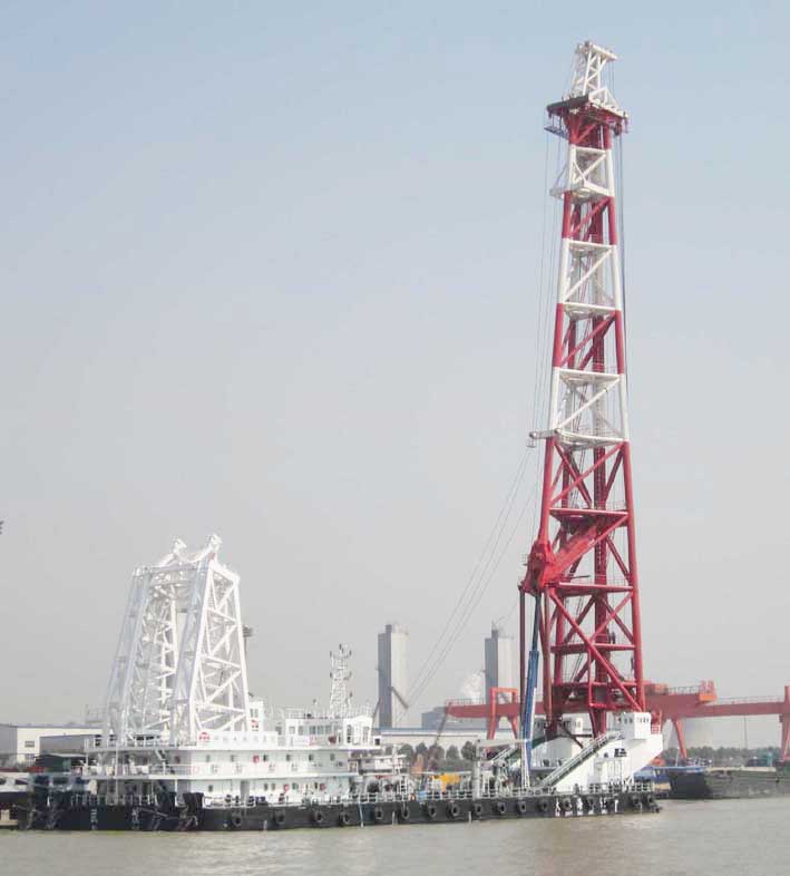 與國內其他打樁船相比,“海威951”打樁船有三大特點:一是該船集打樁和吊裝為一體,一次最大抬吊重240噸,還可以做-27°到﹢25°的變幅;二是可插打18.5°的斜樁,其樁基施工的仰俯角度在國內為最大;三是95米高的樁架可進行三次變幅折疊,變幅后的樁架距水面高度僅有25.4米,可以抵達長江中下游的任何施工地。