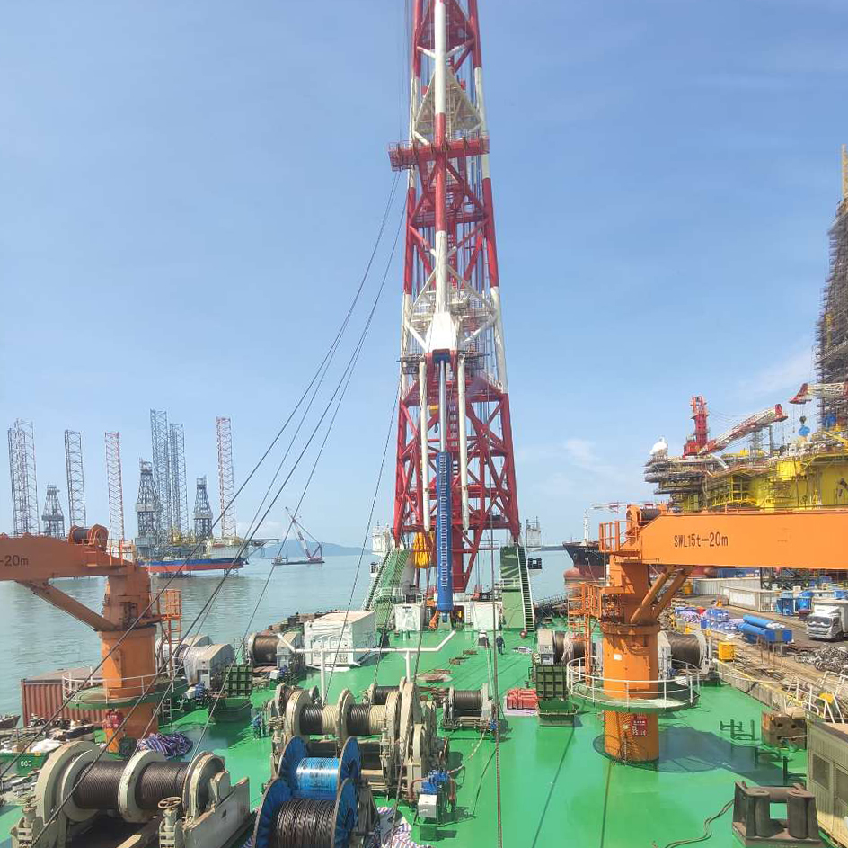 三航樁20號由上海佳豪船海工程研究設(shè)計有限公司設(shè)計,于2018年12月18日在孖洲島開工建造,船長108米、型寬38米、型深7.2米。配備了2臺1760kW驅(qū)動液壓油泵組,設(shè)有2組450噸主吊樁滑車組和1組300噸副吊樁滑車組,樁架高度達(dá)128米,打樁作業(yè)可適應(yīng)最大樁徑為5米、最大樁重450噸的作業(yè)能力,并設(shè)置精度為厘米級的GPS定位系統(tǒng)和四角吃水系統(tǒng),能精確定位打樁。主鉤起重能力450噸,樁架高度133米,樁架最大起重能力700噸,能夠適應(yīng)所有近海區(qū)域及水下50米打樁,可滿足樁長105m+水深,直徑Φ5000mm施工需求,是迄今為止世界上最大最高的打樁船。