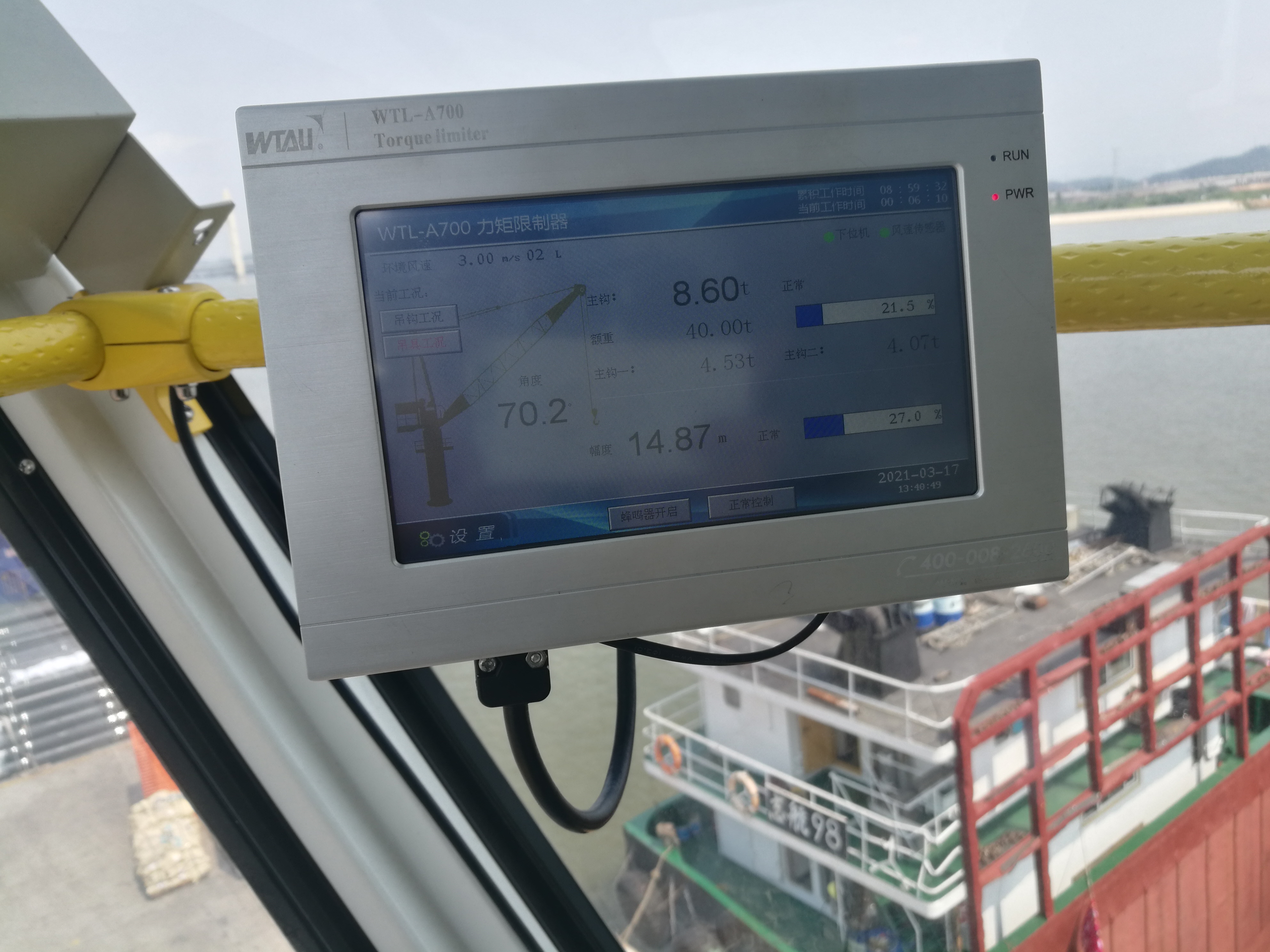 此次為廣東中藝固定式門座機配備的新WTL-A700力矩限制器就是微特主要針對固定式門座機研發,生產的一款實用性非常強的儀表,采用觸摸屏屏顯示,用于四路以下重量信號和一路角度一路風速信號的監控。