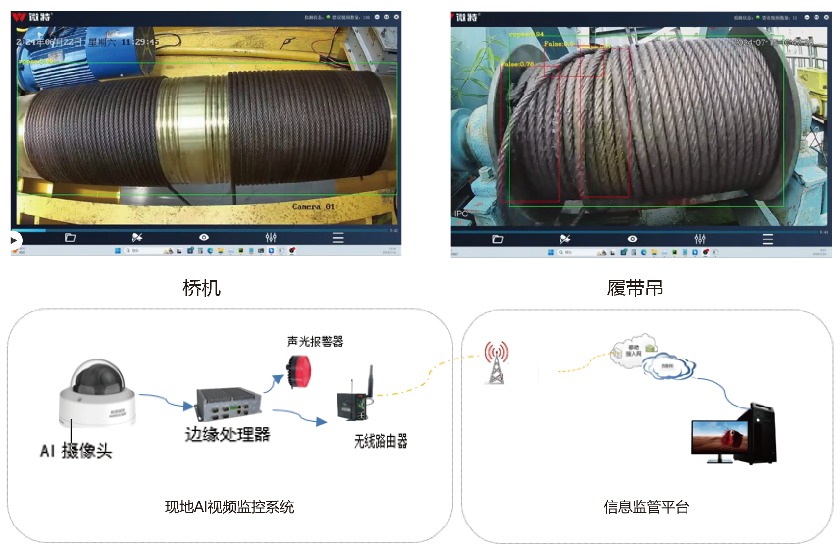 微特技術有限公司開發的基于視頻的AI識別技術可以很好的監測卷筒鋼絲繩的排列,滑輪鋼絲繩是否松脫等多種安全隱患,提供報警提醒操作工,確保卷揚機的正常運作提升鋼絲繩的使用效率和安全性。