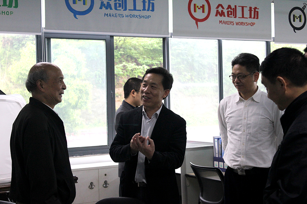 隨后郭主席一行來到眾創工坊及傳感物聯實驗室。董事長聶道靜向郭主席介紹了眾創工坊的運作情況及實驗室的各類實驗設備和實驗平臺。在眾創工坊郭主席與聶董熱情交流,對孵化器建設眾創工坊及免費為創客提供制造平臺表示贊賞,同時還與眾創工坊內的創客交流了創新產品和創意想法。