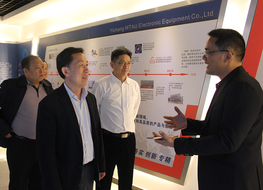 上圖:郭主席一行來到宜昌市微特電子設備有限責任公司,聶道靜作為微特創始人在展廳向來訪領導介紹微特電子的發展歷程。