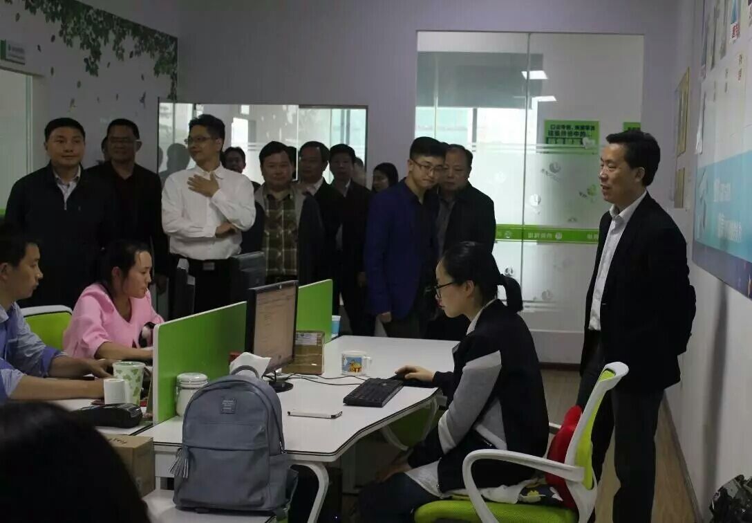 郭主席一行來到創業企業:納新網絡科技有限公司。上圖為納新總經理羅新在辦公區向來訪領導介紹企業發展現狀