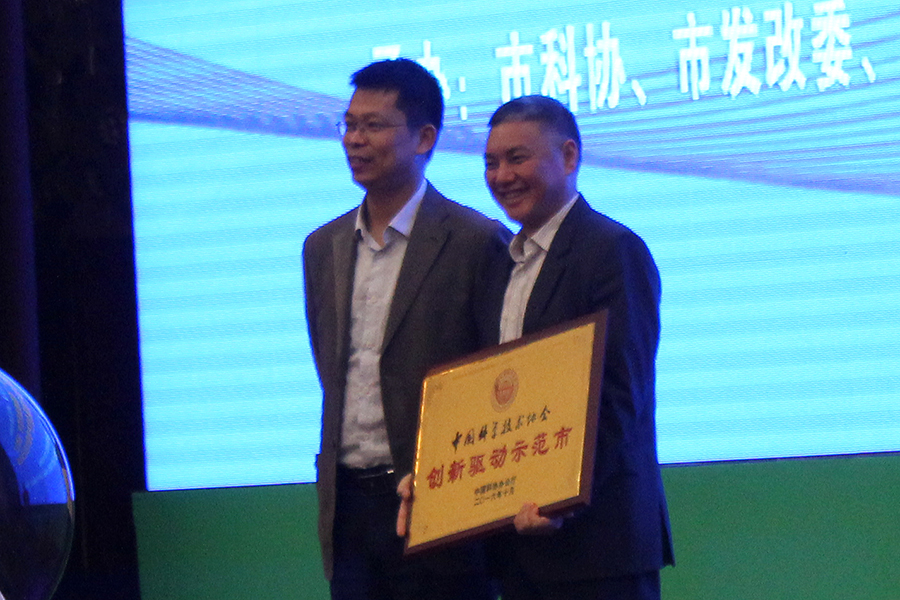中國科協“創新驅動示范市”授牌儀式上,中國科協學會服務中心副主任徐強(左)授牌,副市長王應華(右)接牌。