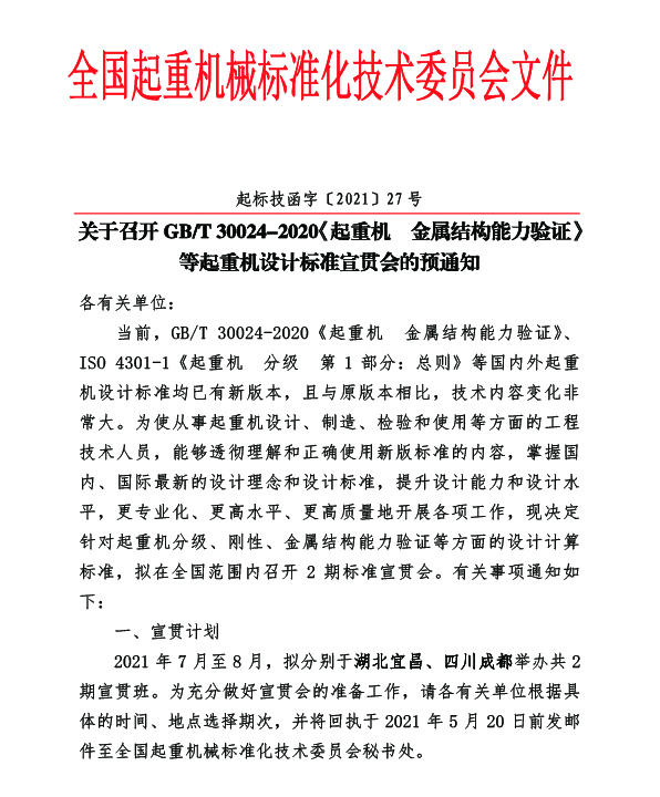 為使從事起重機設計、制造、檢驗和使用等方面的工程技術人員,能夠透徹理解和正確使用新版標準的內容,掌握國內、國際最新的設計理念和設計標準,提升設計能力和設計水平,更專業化、更高水平、更高質量地開展各項工作,全國起重機械標準化技術委員會針對起重機分級、剛性、金屬結構能力驗證等方面的設計計算標準,將于2021年7月至8月分別在湖北宜昌、四川成都召開2期標準宣貫會。