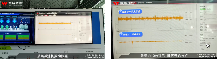 通過(guò)WT-MSAM綜合數(shù)據(jù)采集控制模塊實(shí)時(shí)采集多個(gè)通道的振動(dòng)數(shù)據(jù),通過(guò)頻譜畫(huà)面可以看出兩臺(tái)減速機(jī)的振動(dòng)頻率存在明顯差異。數(shù)據(jù)采集約10分鐘即可開(kāi)始分析。