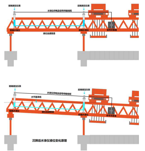 此次我們主要針對(duì)架橋機(jī)過孔和架梁過程中的前高后低姿態(tài),以及整機(jī)橫移過程中前、中支腿軌道平行度狀態(tài)采取實(shí)時(shí)監(jiān)控,讓架橋機(jī)在施工過程中保持良好的運(yùn)行姿態(tài),減少失穩(wěn)帶來的安全風(fēng)險(xiǎn),使架橋機(jī)運(yùn)行更安全,管理更高效。